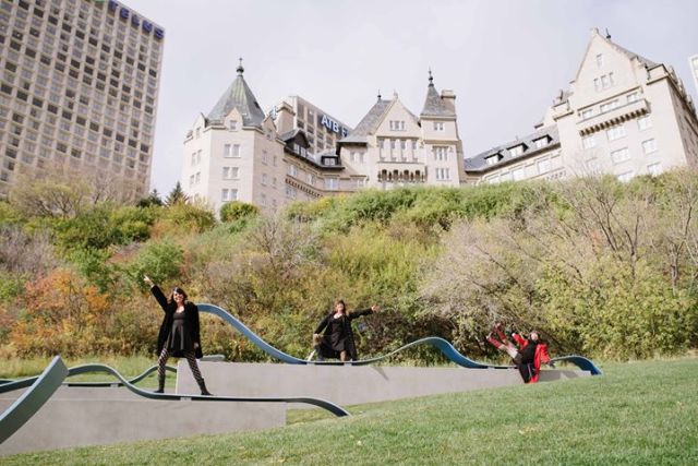 Jang, a multi-talented actor/professional photographer who’s also the manager of the SkirtsAfire Festival, brought an adventurous originality sense of comedy to Girl Brain photo shoots. Ah, and a vivid sense of place. Girl Brain was our sketch comedy trio: Jang would pose the trio on the river valley steps, or at the mall, or in the swanky Roxy Theatre bathroom. Their posters, designed by Jang, are comedies in themselves.