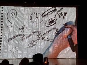 The protagonist of Elaine Weyshko’s Dot bouncing upstairs and down valleys at the outset — surrealist aerobics? — is, yes, a dot. That small but game ink dot, created live by a human hand with a paint brush, takes on challenges, joins other dots, and they evolve into dimensional beings. puppets with their own gibberish language. Yearning, love, struggle, loss, absurdity and tragedy are all within the compass of the domesticated former dot in its (his? their?) expansive new life off the screen…. The scenes, though, at least so far seem laborious and over-extended, a repetitive showcase series for puppetry techniques. A dramaturgical tune-up in the storytelling is in order. Kudos though to the electronic score, delivered onstage live by the Hair Control duo of Rebecca Reid and Ryan Bourne.
