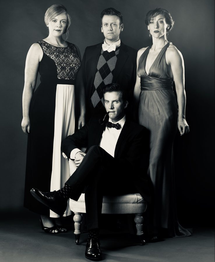 Jenny McKillop, Mat Busby, Belinda Cornish, and Andrew MacDonald-Smith (front) in The Real Inspector Hound, Bright Young Things. Photo by Ryan Parker.